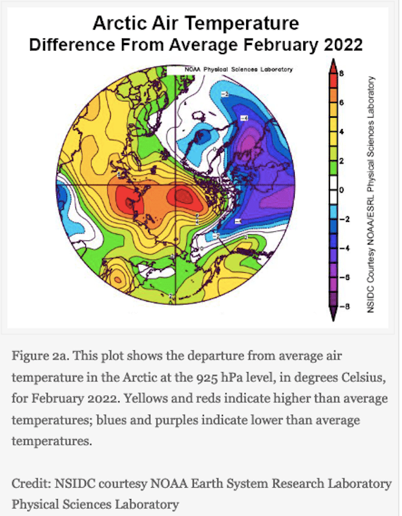 While it made headlines because it is freakish, that parts of Antarctica are 70 degrees F. warmer than usual may just be a fluke. Climate is a trend line you can see over 50 years of changes. Weather is what happens for a day or a week. The more alarming number is one that is slightly lower, which is 50 degrees F. warmer than usual, and it concerns the Arctic, the north pole, not the south. You see the red areas of the map below? They are seriously not supposed to be there, especially at a time when the Arctic is still plunged into the long winter night: