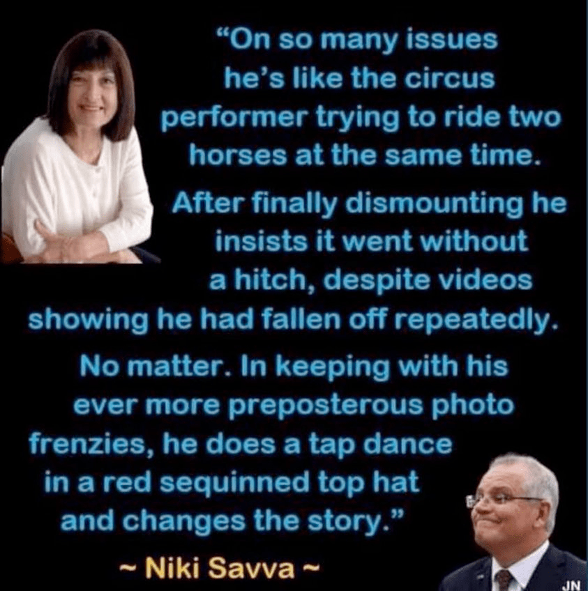 Frydenbergs most recent slogan “Keep Josh” makes him sound more like an Independent who no longer wants to be seen as part of the Losing Team. He should declare which side he’s on. It doesn’t sound as if he expects to win this election or see Scott kept.